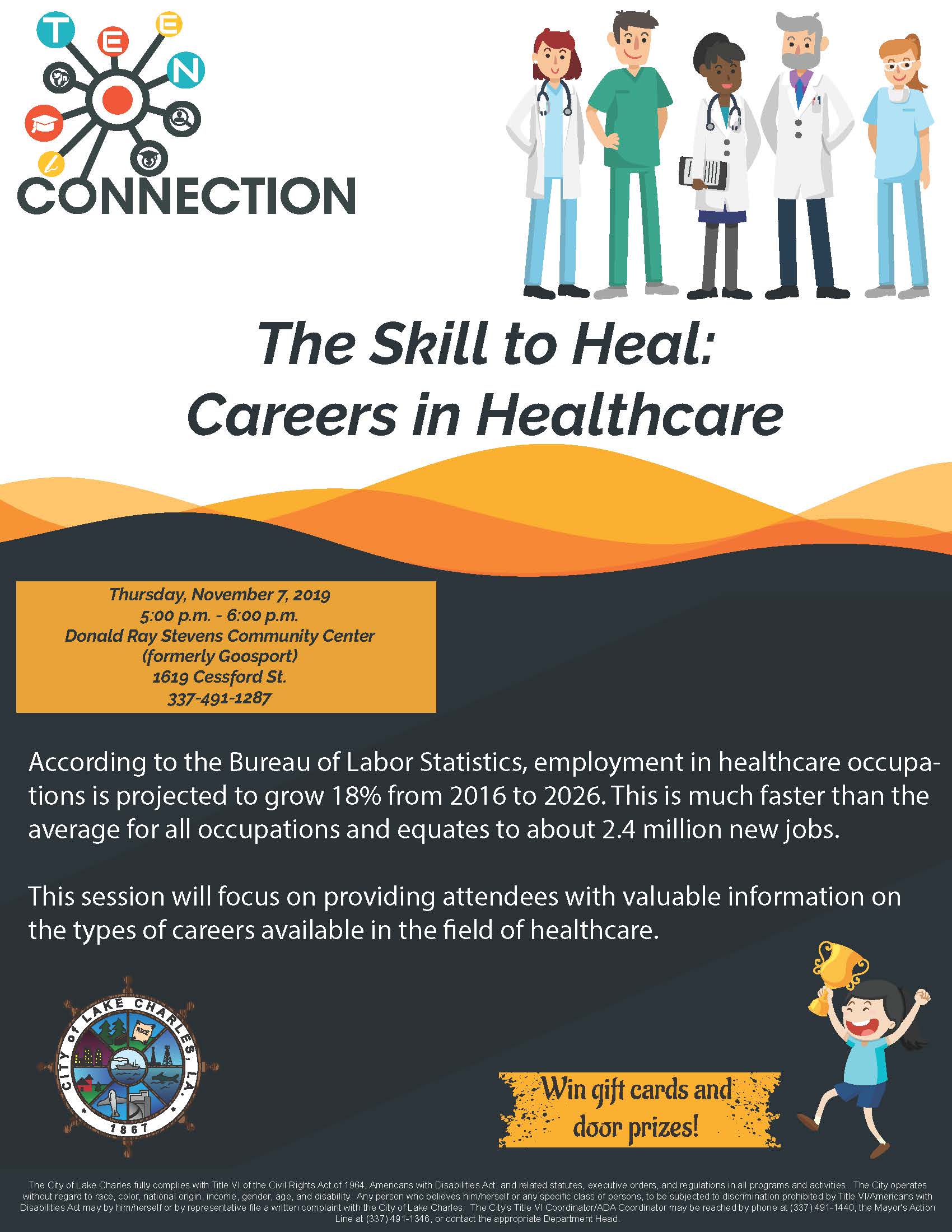On Thursday, November 7, at 5 p.m., the City of Lake Charles’ popular Teen Connection series returns to Cpl Donald Ray Stevens Community Center (1619 Cessford St.). There is no charge to attend and the topic for the session is The Skill to Heal: Careers in Healthcare.
